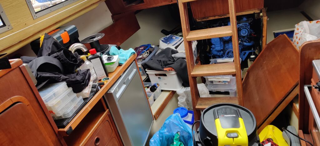Toukokuun viimeinen viikonloppu oli tulossa ja veneen lasku sovittu koulujen päättäjäisviikonloppua edeltäväksi perjantaiksi. Aika paljon asioita oli vielä kesken, ennen kuin olisi saatu purjevene laskukuntoon: muun muassa VHF-antennin ja tuulimittarin asennus mastoon, kölisauman ja pohjaan tulleen kolhun paikkauksen viimeistely, pesu sisältä ja päältä, vahaus sekä maston kuntoon laittaminen.