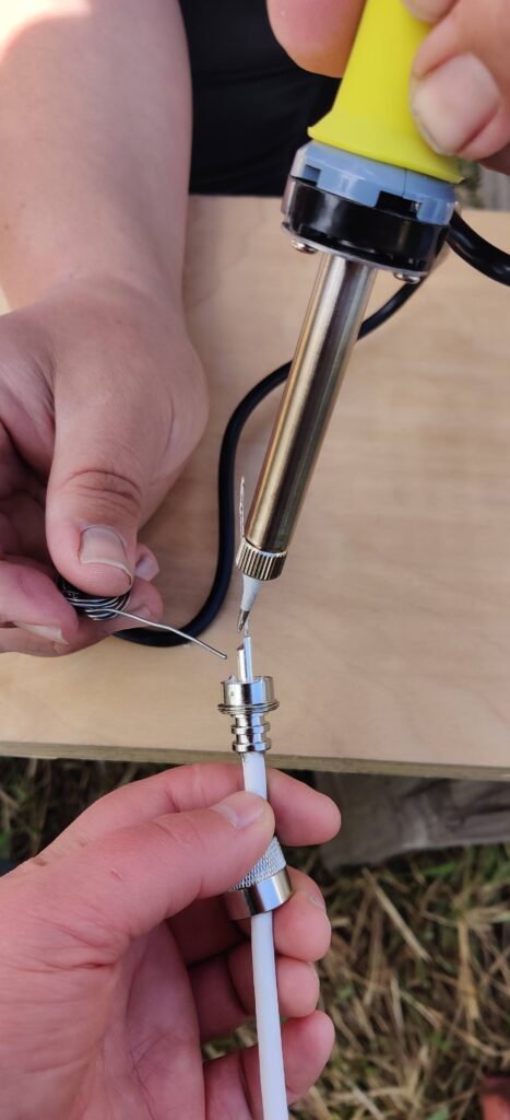 Päivän päätteeksi oli tarkoitus asentaa vielä VHF-antennijohtoon liitin ja kiinnittää se maston huipussa olevaan antenniin. Liittimiä tutkaillessa havaittiin nopeasti, että olisi kannattanut tutustua aiheeseen etukäteen vähän tarkemmin: kyseessä ei ollutkaan mikään pikaliitin ja koko liitos oli ilmeisesti hankala saada onnistumaan. Päätettiin, että päivän työ oli tässä vaiheessa riittävä ja lähdettiin kotia kohti ja iloksemme saimme illaksi kutsun saunaan ja syömään kapun vanhempien luokse.