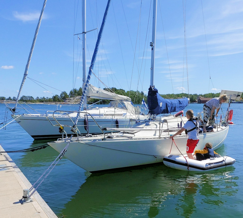 Iltapäivällä vieren tuli vene, jossa oli miehistönä 3-4 nuorehkoa purjehtijaa. He suorittivat ilmeisesti omaa full-experienceään, koska he eivät olleet satamassa kuin hiukan toista tuntia ja sinä aikana ainakin kaksi heistä ehti löhötä riippumatossa, muutama käydä uimassa, joku soutaa lahden yli Stenskäriin ostamaan kalaa ja joku huoltaa venettä. Me luulimme olleemme ahkeria aamupäivällä, mutta tämän miehistön suoritus oli aivan omaa luokkaansa!
