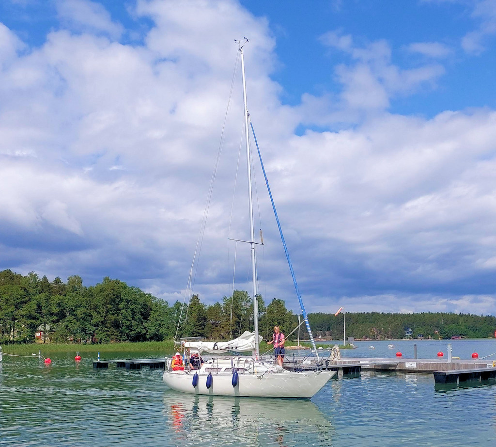 Pitäisi varoa mitä ehdottaa, koska keskustelun päätteeksi kapu jäi laiturille ja försti ja gastit peruuttivat laiturista ulos ja lähtivät kurvailemaan aisalaitureita kohden. En tiedä kuka jännitti eniten, mutta sekä lähestyminen, että itse rantautuminen sujuivat mainiosti ja vene saatiin ilman draamaa kiinni sen paikan viereen, jossa istuskeltiin viime vuonna. Suoritus jatkui sillä, että vanhempi gasti lähti tiskaamaan, nuorempi viemään roskia keräykseen ja försti pyykkejä pyörimään. Seuraavaksi täytettiin vesivarastot ja siivottiin vene satamakuntoon. Kun pyykit oli vaihdettu kuivausrumpuun, lähdettiin käymään kaupassa vetokärryn ja puutelistan kanssa. Kun saalis kahdesta kaupasta ja pitkäripaisesta sekä kauppareissun aikana kuivuneet pyykit oli purettu veneeseen, alkoi kaikilla olla nälkä.