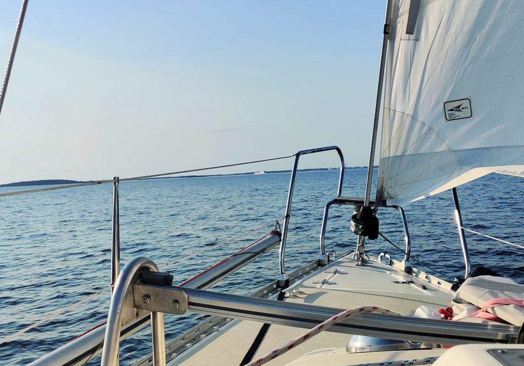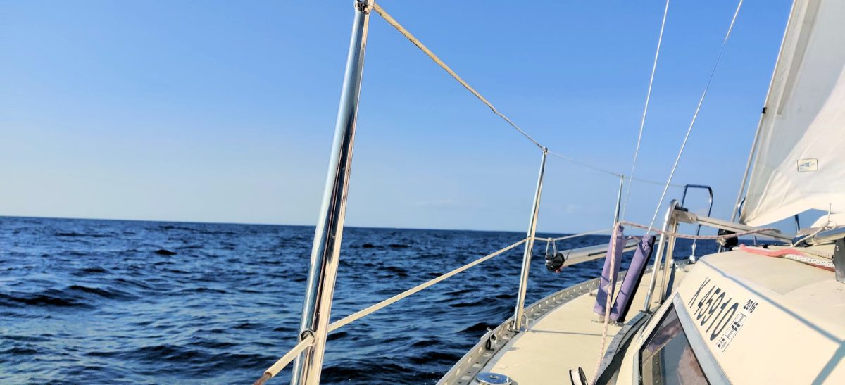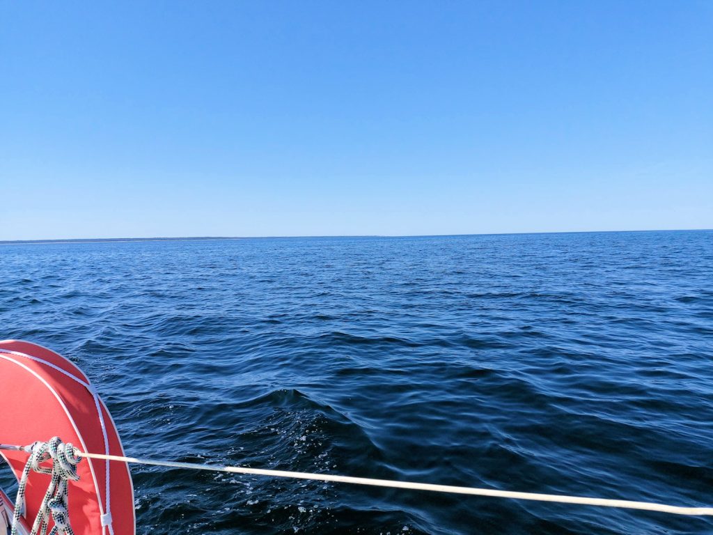 Ylityksen aikana kokkasimme lounasta ja välipalaa ja kapu harjoitteli vauhdissa tiskaamista. Varsinainen ylitys oli melko tapahtumaton ja olimme siitä tyytyväisiä. Paras purjehdus on hiukan tylsä purjehdus! Päivällä avomerellä purjehtiminen oli melkoisen erilaista kuin saaristoväylillä, jossa on koko ajan muuta liikennettä ja jatkuvasti pitää navigoida ja ohjailla. Jos ylitys olisi ollut pidempi, vahdissa olisi hyvin voinut lukea vaikka kirjaa tai neuloa sukkaa.