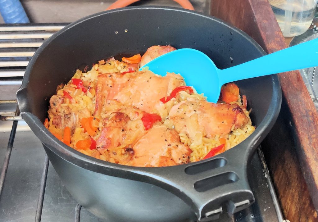 Olimme tulossa rantaan juuri päivällisaikaan, kuten aika usein käy. Jos päivällistä alkaa kokata vasta rantautumisen jälkeen, ovat kaikki nälästä kiukkuisia siinä vaiheessa, kun saadaan ruoka pöytään. Jos taas ruuan valmistaa etukäteen, se ehtii jäähtyä satamamanööverien aikana. Muun muassa tästä syystä uuni veneessä on mainio kapistus. Uuniruuan voi helposti valmistella lähestymisen aikana ja se kypsyy itsekseen sillä aikaa kun miehistö kiinnittää veneen ja siistii paikat. Hankoa lähestyessä uunipataan pilkottiin sipulia, paprikaa, porkkanaa, valkosipulia ja kesäkurpitsaa, mukaan laitettiin riisiä ja mausteita (suola, pippuri, kanaliemikuutio, yrttejä) ja riisi-kasvispedin päälle Kärdlasta ostettu marinoitu kana. Folio päälle ja pata uuniin. Vajaan tunnin kuluttua on valmiina höyryävä, valmis ateria.