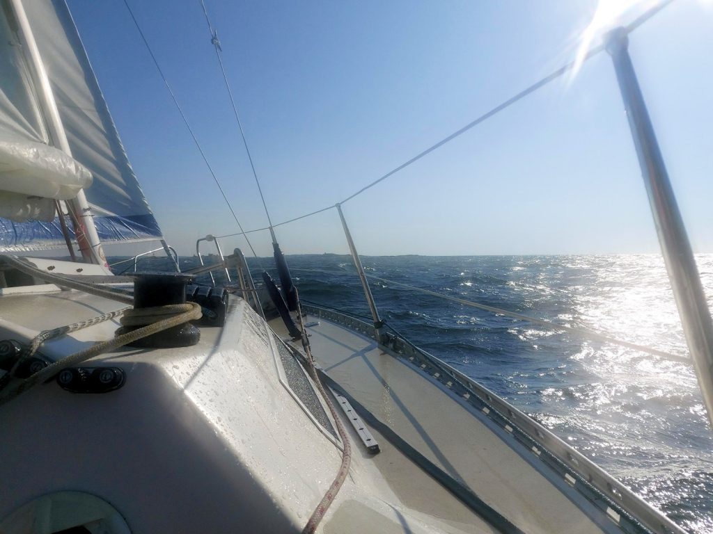 Tuulta oli jo aamusta aika paljon ja juhlaliputuksen laskeminen oli siksi jännittävää. Emme halunneet sotkea lippusarjaa sen enempää omaan kuin naapurienkaan rikiin, emmekä menettää ison falliakaan, jolla liput oli nostettu maston huippuun. Saimme liput kunnialla veneen kannelle pienellä säätämisellä. Laitoimme Herkun muutenkin lähtökuntoon ja lähdimme ripeästi matkaan kakkosreivatulla isolla.