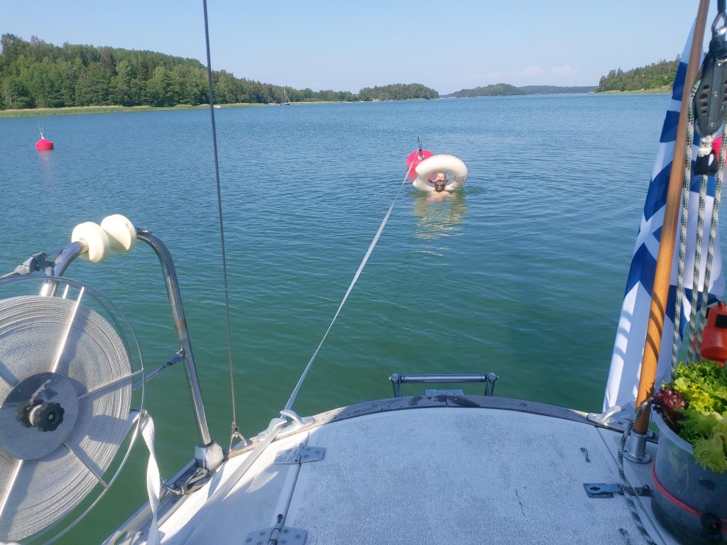 Kun olimme päässeet rantaan kiinni ja saaneet pähkinät siivottua, söimme ja hyppäsimme uimaan ihanan lämpimään, toistaiseksi levättömään veteen. Helle oli väsyttänyt koko miehistön, ja kapu varsinkin oli aivan poikki rankan kryssin jäljiltä. Piipahdimme kuitenkin vielä iltasaunassa pesulla ja kapu jaksoi kokata päivälliseksi jauhelihapihvejä, uusia perunoita ja pippurikermakastiketta.