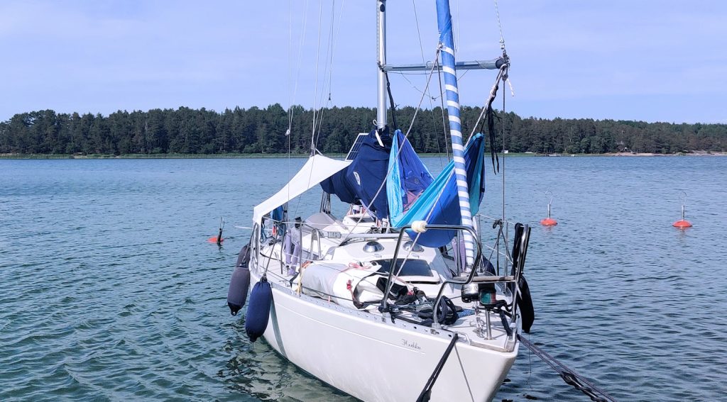 Yö oli edellisiä viileämpi ja kaikki saivat kunnon yöunet. Akusto aurinkopaneeleineen kesti yön tällä kertaa hyvin, vaikka olimme irti maasähköstä. Lähdimme aamulenkin jälkeen ajelemaan kohti Houtskaria aivan tuulettomassa säässä. Vähitellen pientä tuulta virisi ja nostimme purjeet. Tuuli tuli tottakai suoraan vasten, joten kryssiä oli jälleen luvassa. Kevyt tuuli pyöri kapeissa salmissa, mutta tikkasimme sitkeästi eteenpäin.