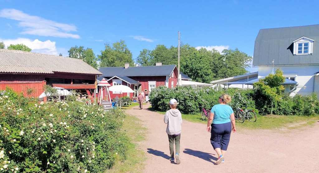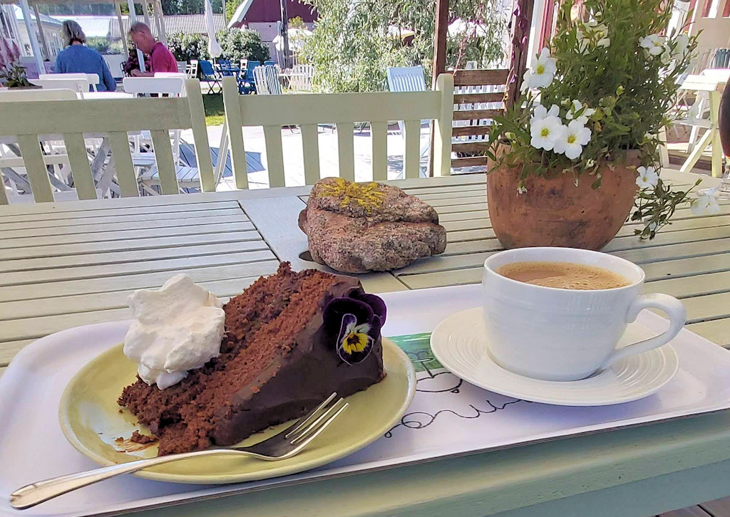 Kapu lohkaisi vitsillä, että pääseehän salmen yli lossilla ja lossirannasta olisi sopiva lenkkimatka kylpylälle. Försti yllytti hiukan ja niinpä rantautumisen jälkeen katsottiin lossiaikataulu ja rantatutumisjäätelön, – kahvin ja -viskin jälkeen E lähti marssimaan lossille ja sitten treenaamaan. Jäljelle jääneet päättivät lähteä myös hiukan reippailemaan. Yllättäen kävelylenkki päättyi Farmor’s Cafehen porkkana- suklaa- ja mutakakulle. Kakut olivat herkullisia, kuten aina, ja niin tuhdin kokoisia, että muuta välipalaa ei tarvittukaan. Förstin ja pikku-e:n nurmikkojalkapallo päättyi tasapisteisiin 2-2 ja sitten olikin hyvä palata veneelle valmistelemaan illaksi lasagnea ja pohtimaan seuraavan päivän suunnitelmaa.