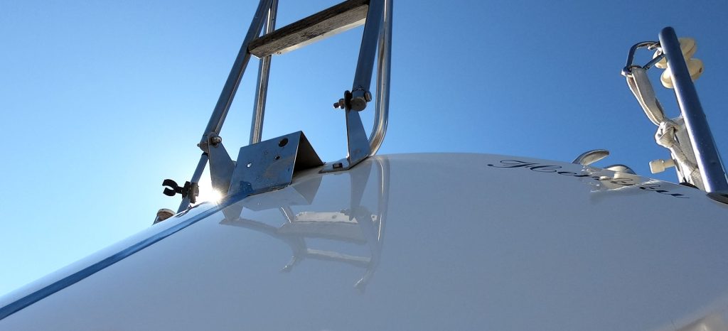 Koko veneen kylkien kiillotus onkin jo huomattavasti raskaampi urakka kuin pelkän peräpeilin puolikkaan käsittely. Meidän 31-jalkaisen veneen kiillotukseen kului kaksi täyttä työpäivää. Näin jälkikäteen ajatellen, työ olisi kannattanut jakaa esimerkiksi neljään osaan, jotta kokonaisuus pysyy hallittavana eikä kuormitus käy liian suureksi kerralla. Me tajusimme tämän vähän liian myöhään, kun ensimmäinen hiontakierros oli jo tehty. Työtä ei oikein voi jättää kesken, vaan aloitettu alue pitää tehdä loppuun saakka, jotta pintaan saadaan heti suojaava vahakerros.