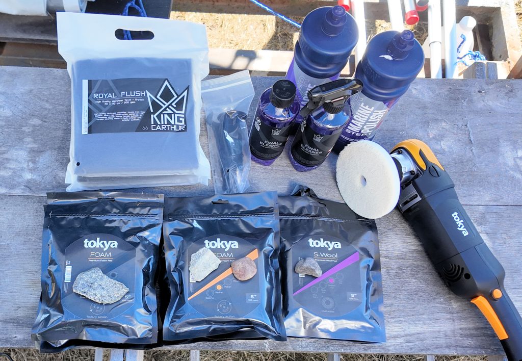 Veneen kylkien kiillotus ei oikeastaan ole välineurheilua, mutta oikeilla työkaluilla työ on huomattavasti helpompaa ja lopputulos parempi. Kiillotuskoneen, kiillotus- ja puhdistusaineet sekä laipat ja muut tarvikkeet voisi hankkia erikseenkin, mutta se vaatisi paljon selvittelytyötä. Halusin itse mennä mahdollisimman suoraviivaisella setillä – sellaisella, jolla koko projektin pystyy tekemään alusta loppuun ilman arvailua siitä sopivatko aineet ja välineet yhteen, osaanko valita oikeat tuotteet tai puuttuuko jotain tärkeää.